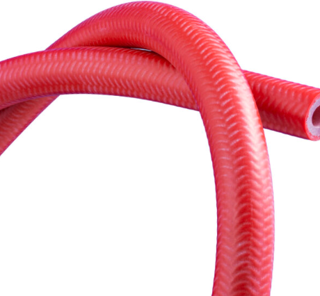 Gewapend Siliconenslang; 70 +/-5 Shore A; binnen transparant, buiten rood gecoat; met monofilament omvlochten; temperatuurbereik -60 °C tot +180 °C